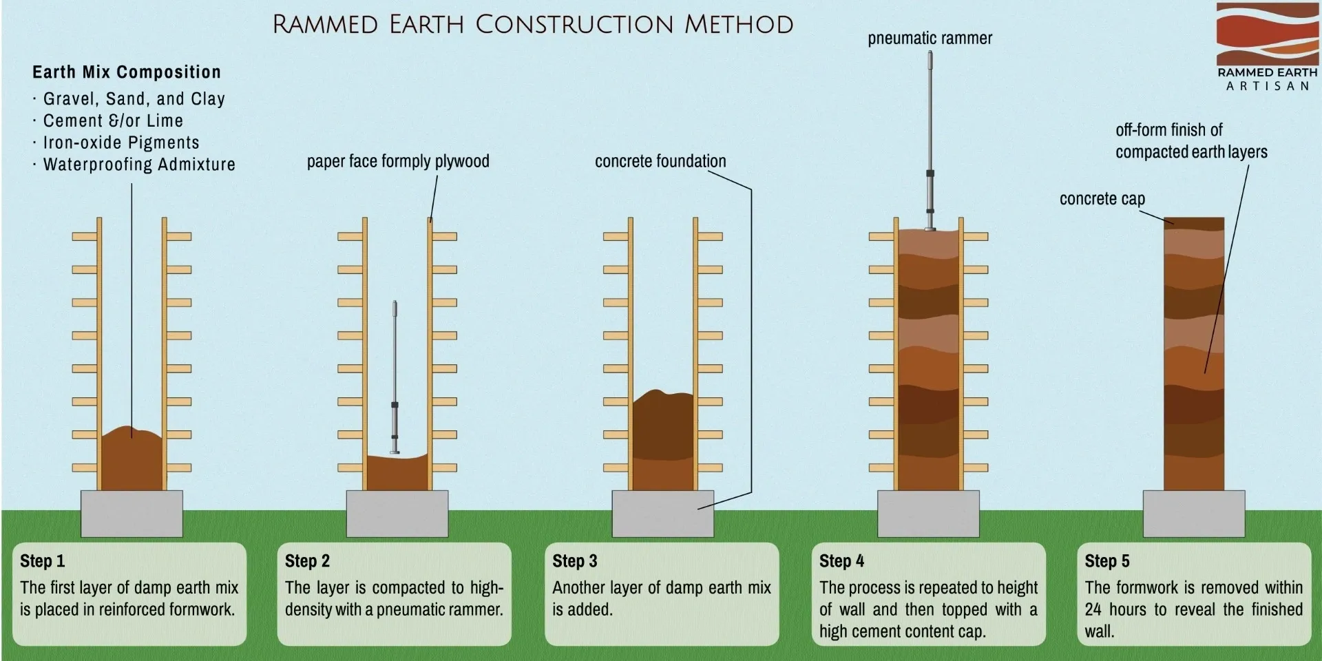 Rammed earth construction creates beautiful, functional, high-performance walls that are inherently one of a kind, durable, maintenance free, and environmentally responsible.