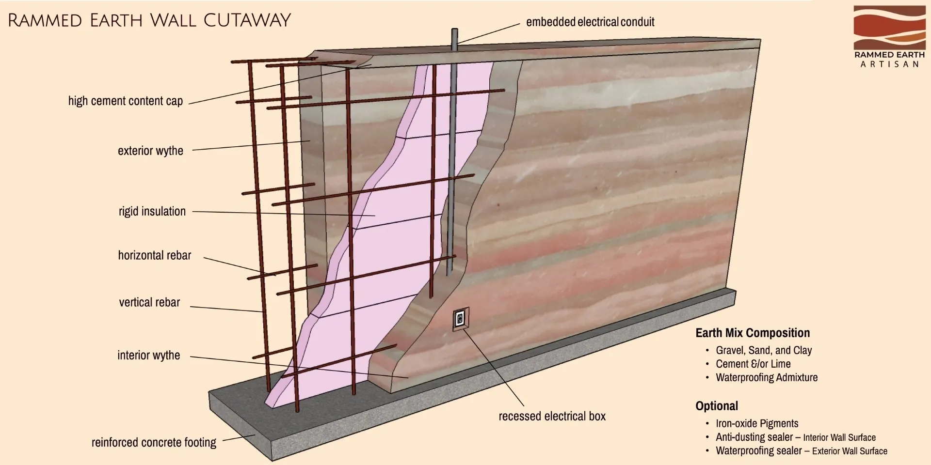 Rammed Earth Artisan merges traditional techniques with modern improvements in building science to produce high-performance, stabilized, reinforced, and insulated, structural rammed earth walls. Our walls will last for centuries, even millennia, with little to no maintenance required. This is accomplished with the use of locally available, quarry-sourced aggregates, stabilizers (cement, lime, etc.), hydrophobic admixtures specifically designed for rammed earth construction, iron oxide pigments, rebar reinforcement, and a core of rigid insulation for exterior walls. The use of pneumatically powered rammers provides superior and consistent compaction, as well as reducing the manual labour component of rammed earth construction.