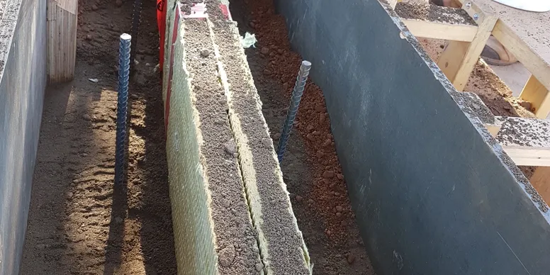 To maintain the characteristic aesthetic of rammed earth on both the interior and exterior walls, insulation is sandwiched in the inside of the walls, either in the middle, or offset slightly to the exterior.